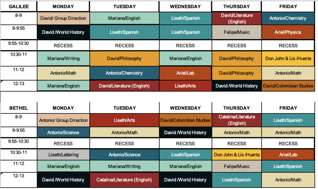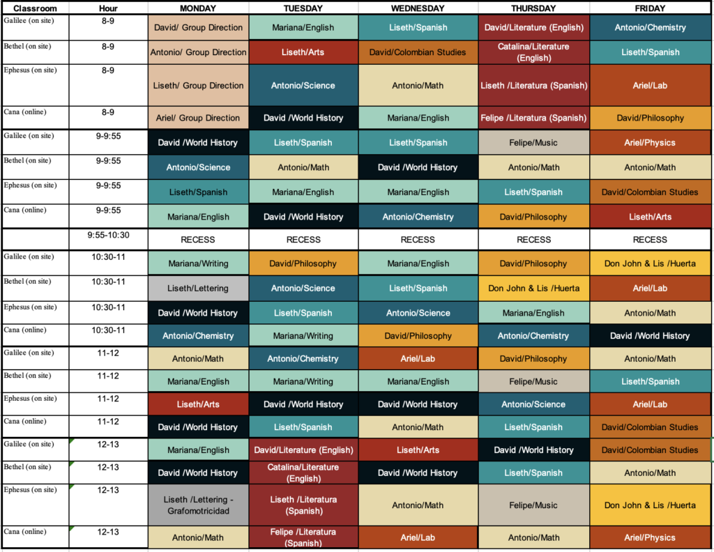 A continuación podrán ver el horario de clase para cada salón. El primer dia de clases, los niños tendrán el escritorio con su nombre para saber en cuál quedaron. Todos los estudiantes online se debe conectar al nuevo link del salón de Cana (antiguo Sinaí y Nazareth). Cambiamos la plataforma de video llamada, ya no se utilizará más Skype, estaremos utilizando google meet. Al correo de cada estudiante le llegará la invitación para ingresar el salón online. En caso de no recibir la invitación, pueden ingresar al siguiente link y avisarle al area administrativa para el envío de la invitación.